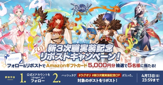 新たな「3次職」実装を記念して、Xにてキャンペーンを実施します。『ラグナロクオリジン』公式Xアカウント(@ragori_jp)をフォローし、「#ラグオリ」 「#新3次職実装記念CP」 の2つのハッシュタグが入ったポストをリポストしてください。抽選でAmazonギフトカード(5,000円分)を5名様にプレゼントします。たくさんのご参加をお待ちしております。