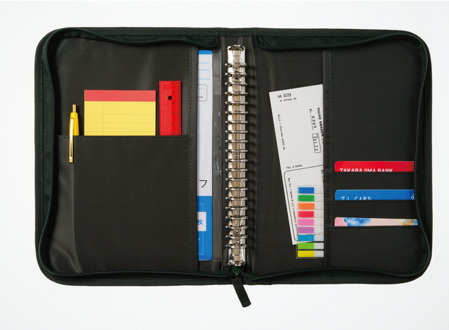 市販のルーズリーフも使える便利な20穴バインダー。左右に大きなポケット、ペンや定規など⾧めのものを収納できるポケット、カードポケットがついていて、収納力も抜群!