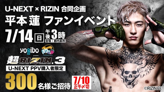 USEN&U-NEXT GROUPの株式会社U-NEXT(本社:東京都品川区、代表取締役社長:堤 天心)が運営する動画配信サービス「U-NEXT」は2024年7月28日(日)に開催される『Yogibo presents 超RIZIN.3』をライブ配信いたします。さらにU-NEXTで配信チケットを購入された方の中から抽選で300名様に平本蓮選手のファンイベント「U-NEXT x RIZIN 合同企画 平本蓮選手ファンイベント」にご招待いたします。