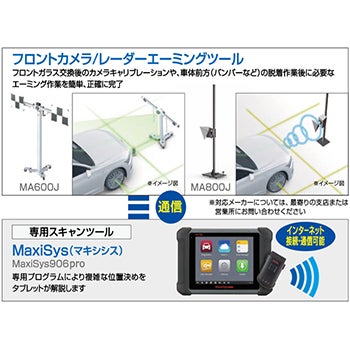 本製品は、フロントガラス交換や前方バンパー脱着後に必須となるエーミング作業を、簡単かつ正確に実施できる最新ツール。専用プログラムにより、車種ごとの整備情報もタブレット上で簡単検索・呼び出しが可能。作業者はガイドに従うだけで、乗用車全般に対応する高精度なカメラキャリブレーションを実現します。