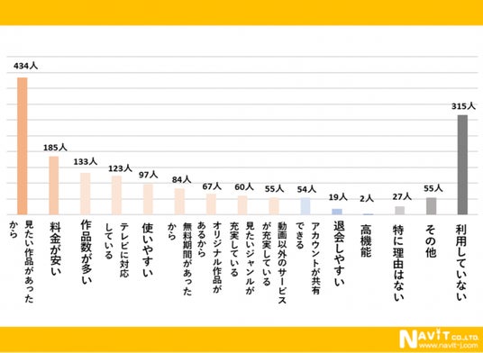 その動画配信サービスを選んだ理由は何ですか?。というアンケートに対して一番多かったのは「見たい作品があったから」が434人で、次に多かったのが「料金が安い」で185人、3番目に多かったのが「作品数が多い」で133人という結果になりました。やはり、見たい作品があるのは魅力的ですよね。