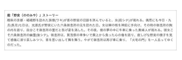 本公演をより楽しんでいただくべく、デーモン閣下は動画にて英語、日本語字幕で内容を解説。能楽師の山井氏、二十五絃箏奏者の中井氏、そして“悪魔”である自身の自己紹介に始まり、本公演で演じる、『源氏物語』が元となる能の戯曲「野宮」「葵上」の解説、そして重要な登場人物である六条御息所についてもわかりやすく説明。能や源氏物語になじみのない人でも、安心してお楽しみいただける内容となっています。