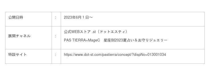 株式会社アダストリア(本部:東京都渋谷区渋谷2-21-1、代表取締役社長:木村 治)の子会社、株式会社エレメントルールが展開する「PAS TIERRA(パティエラ)」は、『PAS TIERRA × MageC 星座別2023夏占い&お守りジュエリー』と題して、この夏の各星座の運勢と、「火・地・風・水」の4つに分けられた星座のエレメントに合わせたお守りジュエリーをレクチャーするコンテンツを公開いたしました。占星術師MageC氏とは、昨年11月に発売した星座ジュエリーと、2023年上半期占いでコラボレーションに続き再タッグを組み、「占いxジュエリー」の人気企画をともに盛り上げます。