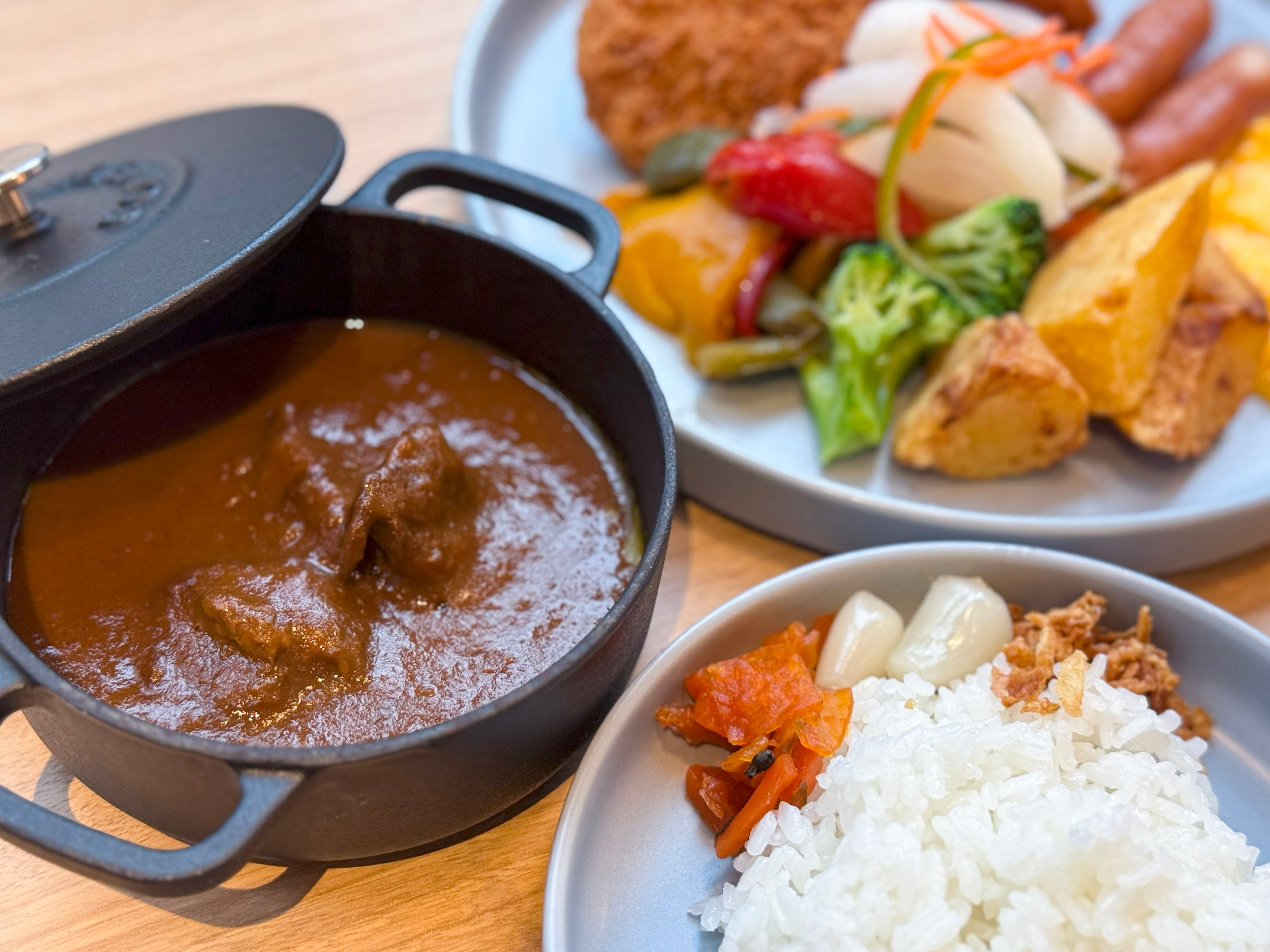 唐揚げ、ポークヒレカツ、ソーセージ、ゴロゴロ野菜、スクランブルエッグ、ジャガイモ、白飯、サフランライス、らっきょう、福神漬け、オニオンフライ