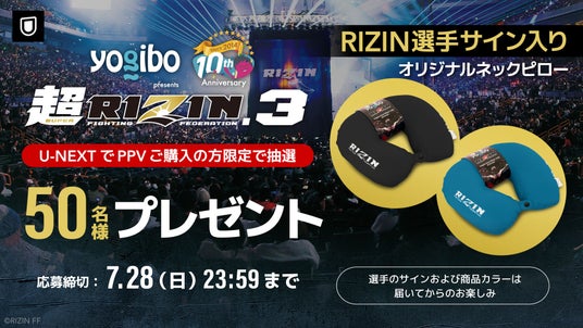 USEN&U-NEXT GROUPの株式会社U-NEXT(本社:東京都品川区、代表取締役社長:堤 天心)が運営する動画配信サービス「U-NEXT」は2024年7月28日(日)に開催される『Yogibo presents 超RIZIN.3』に先立ち、2024年7月18日(木)より過去大会のフルファイトを収録したアーカイブを見放題にて順次配信開始いたします。さらに配信チケット購入者限定のプレゼントキャンペーンの実施も決定いたしました。