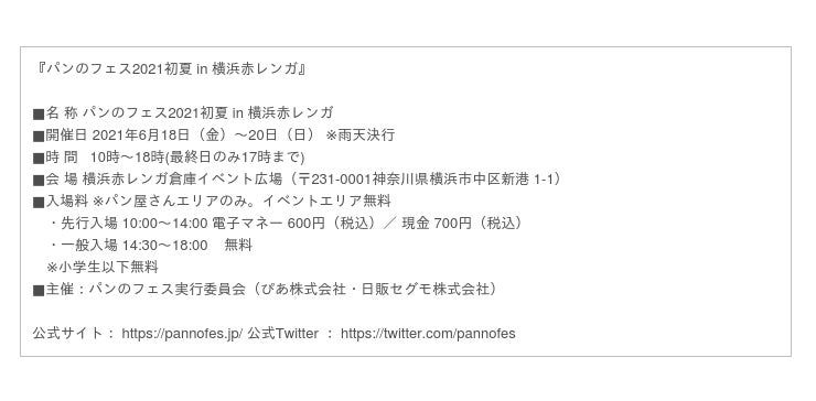 レジャー・エンタテインメントのチケット販売及び各種イベントの企画・運営等を行うぴあ株式会社(代表取締役社長 矢内 廣) と、「パンシェルジュ検定」を運営する日販セグモ株式会社( 代表取締役社長 安井邦好) は、2021年6月18日(金)~ 20日(日)の3日間、横浜赤レンガ倉庫イベント広場にて「パンのフェス2021初夏 in 横浜赤レンガ」を共同で開催いたします。