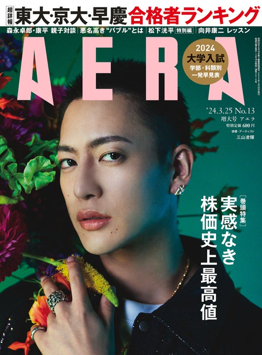 3月19日発売のAERA3月25日増大号は、大学合格ランキングシリーズの第3弾となる「東大・京大・早稲田大・慶應大の合格超詳報」を届けます。どの高校からの合格者が多いのか、学部・科類別でわかる“一発早見表”を一挙に掲載しています。今号も“絶対保存版”の一冊です。表紙を飾るのは、4月1日からスタートするNHK連続テレビ小説「虎に翼」に出演する三山凌輝さん。BE:FIRSTのメンバーとして快進撃を続ける三山さんが、単独では初めてAERAの表紙に登場します。巻頭特集は「実感なき株価最高値」と題し、かつてのバブル期を超える株高になっても景気の良さや賃金上昇を実感できない現実とのギャップについて深掘りします。創刊以来続く名物連載「現代の肖像」。今号は、国境なき医師団のスタッフとして、パレスチナ自治区ガザ地区で人道支援に携わってきた白根麻衣子さんの人生に迫ります。大好評連載「松下洸平 じゅうにんといろ」は特別編。11~20人目のゲストとの対談を松下さんが振り返ります。ほかにも、多彩な記事が詰まった一冊です。大学合格ランキングが続く今号は、発売日が月曜日ではなく、3月19日(火)となります。
