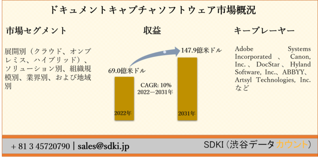 SDKI Inc.は、「ドキュメントキャプチャソフトウェア市場ーグローバル予測2022ー2031年」新レポートを 2022年02月08日に発刊しました。この調査には、ドキュメントキャプチャソフトウェア市場の成長に必要な統計的および分析的アプローチが含まれています。レポートで提供される主要な産業の洞察は、市場の既存のシナリオに関する読者に市場の概要についてのより良いアイデアを提供します。さらに、レポートには、市場の成長に関連する現在および将来の市場動向に関する詳細な議論が含まれています。