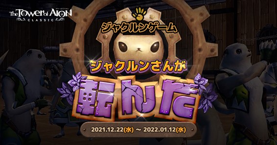 PC向けオンラインゲーム『The Tower of AION(以下、タワー オブ アイオン)』をサービス、運営しているエヌ・シー・ジャパン株式会社(本社:東京都港区、代表取締役:金 澤憲(キム テクホン))は、本日2021年12月22日(水)より、クラシックサービスにて新イベント「ジャクルンゲーム」第1弾となる「ジャクルンさんが転んだ」の開催と、開催中の「ジャクルンゲーム」開催記念Twitterキャンペーンをお知らせします。