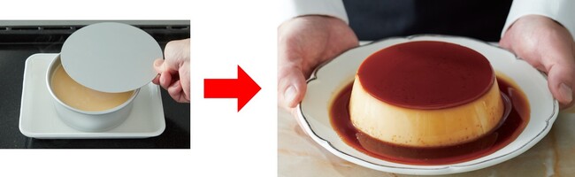 解決策は意外と簡単! ふたをしてプリン液に直接風が当たらないようにすればよいので、型よりもひと回り大きなふたが付いたお菓子型が誕生しました。