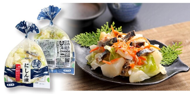 鰊の旨味と麹の甘味が特徴。にしん漬けは、北海道を代表する郷土漬物であり、こだわりの製法で鰊の旨みを引き出し、老若男女問わず親しまれる味わいで、通年を通して人気の逸品。パッケージは青色をメインカラーとして「北の海ずっと美しく」のロゴデザインと合わせ、海をイメージさせるCHANGE FOR THE BLUE仕様の特別デザイン。