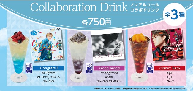 楽曲をイメージした「Congrats!!」「Good mood」「Comin' Back」の3種[各750円(税込)ノンアルコール]をご用意しました。