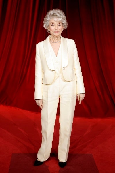 リタ・モレノは、2024年クルーズ コレクションからアイボリーのウールとシルクのジャケットとベスト、パンツを纏い、ディオールのシューズを合わせました。