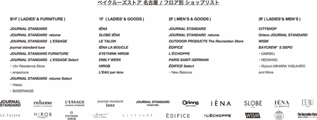 ベイクルーズストアとは、アパレル大手のベイクルーズが手掛けるグルーピングストア。 3/24(木)にオープンを迎えるベイクルーズストア 名古屋では、 JOURNAL STANDARD、IÉNA、ÉDIFICEなどの人気ブランドをはじめ、 CITYSHOP、L’ÉCHOPPE 、WISMなど東海地方初出店を含むベイクルーズが誇る20ブランドがラインナップ。