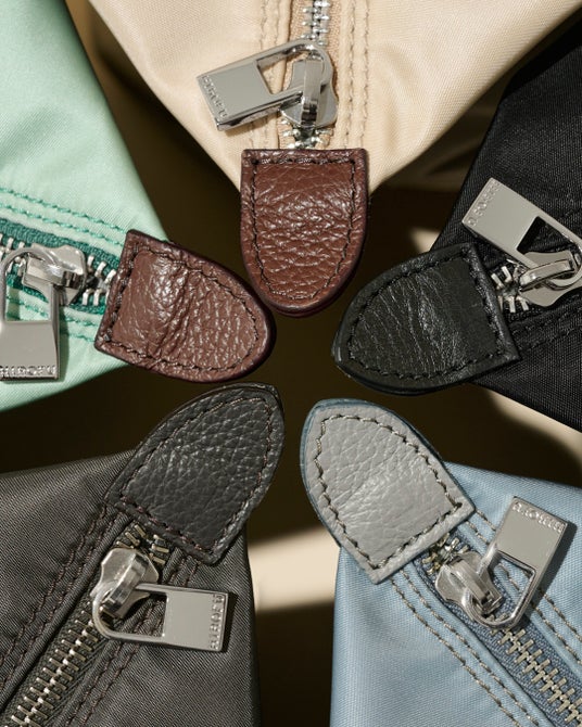 カラー展開は、ベーシックなものから華やかな明るい色までの5色をご用意しました。ハンドル部分とジッパーサイドには、小シボを型押ししたイタリア製カーフレザーを贅沢に使用。
