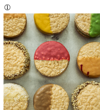 1.ダックワーズにピスタチオやクリームチーズ、キャラメルチョコなどのムースやカスタードクリームをサンドし、外側をチョコレートでコーティングした、丸いフォルムのカラフルな進化系ダックワーズ。