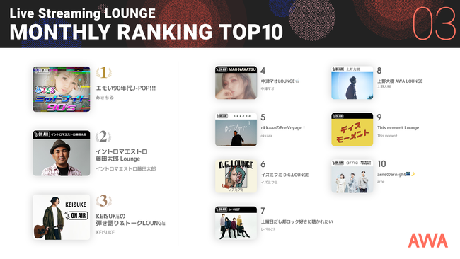 AWA株式会社(本社:東京都港区、代表取締役CEO:冨樫晃己)が運営する、サブスクリプション型(定額制)音楽ストリーミングサービス「AWA(アワ)」は、2022年3月1日(火)から3月31日(木)までに開催された、音声ライブ配信を利用した「ラジオ配信ラウンジ」の視聴数、開催頻度、リアクション数などを総合して、2022年3月の人気ラジオ配信ラウンジランキングTOP10を発表いたしました。