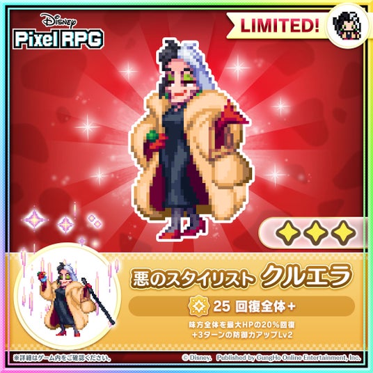 『ディズニー ピクセルRPG』の世界に初登場となる『101匹わんちゃん』から「悪のスタイリスト クルエラ」がラインナップされた、期間限定ガチャが登場です。ぜひ仲間にして、お気に入りのキャラクターたちと一緒に冒険へ出かけましょう。