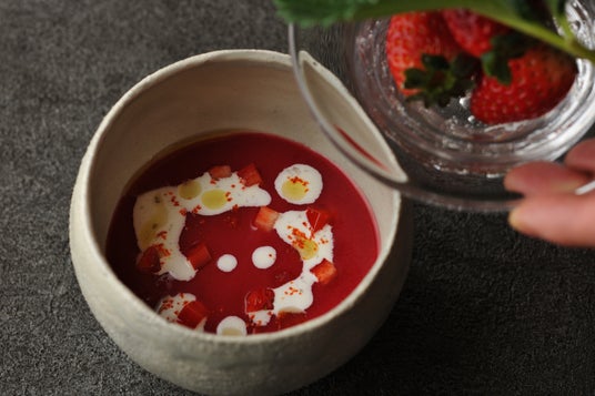 苺のカペッリーニ(*2)に、サラミの旨味とホワイトバルサミコ酢を合わせた爽やかな味わいの冷製パスタです。仕上げに苺のマリネやトマトのジュレ、オレガノを合わせ、苺の香りや味わいを堪能できる一皿です。