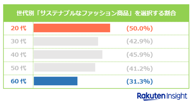 ・「サステナブルなファッション商品」を選ぶと答えた人は4割以上で、20代の半数が選択