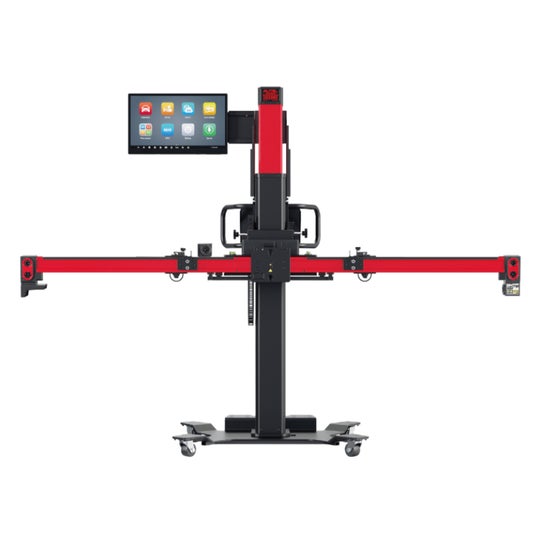 エ ーミング作業ではフレームにターゲットを取り付けて使用できます。また、複数台のカメラでホイールターゲットの高さを自動認識し、車両をリフトアップした状態でもアライメントの測定を可能です。スキャンツールのソフトウエアを搭載したタブレット端末も付属し、アライメントの測定や調整からエーミングの作業を一連の流れで完了できます。これにより、従来に比べて飛躍的に作業時間を短縮する機器に仕上げます。