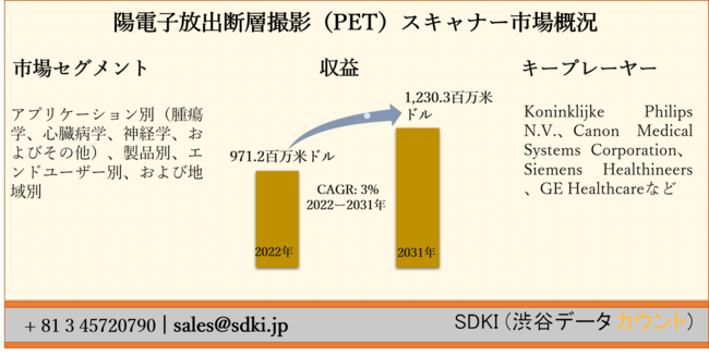 SDKI Inc.は、「陽電子(ポジトロン)放出断層撮影(PET)スキャナー市場ーグローバル予測2022ー2031年」新レポートを 2022年02月09日に発刊しました。この調査には、陽電子放出断層撮影(PET)スキャナー市場の成長に必要な統計的および分析的アプローチが含まれています。レポートで提供される主要な産業の洞察は、市場の既存のシナリオに関する読者に市場の概要についてのより良いアイデアを提供します。さらに、レポートには、市場の成長に関連する現在および将来の市場動向に関する詳細な議論が含まれています。