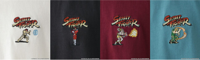 今回のコラボレーションは、プリントと刺繍のTシャツ2型を展開します。プリントTシャツは「ストリートファイターII」の過去作品のパッケージのデザインがフロントやバックにプリントされています。刺繍Tシャツでは「リュウの波動拳」「ダルシムのヨガフレイム」「ガイルのソニックブーム」「ベガのヘッドプレス」といった象徴的な必殺技がそれぞれ左胸に刺繍されています。