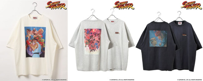 印象的な「ストリートファイター」の過去作品のメインイラストがそれぞれフロントやバックに大胆にプリントされいる一着。作品の世界観が伝わってくる臨場感あふれるデザインになっています.
