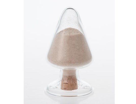 おが粉を微細化した「木粉」を展示。電気部品や人工木ウッドデッキに使われている。