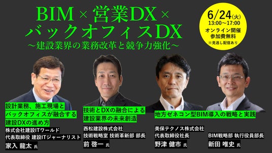 産経新聞社(東京都千代田区、社長・近藤哲司)は、オンラインセミナー「BIM × 営業DX × バックオフィスDX ~建設業界の業務改革と競争力強化~」を6月24日(火)13時からオンラインで開催。参加者を募集します。