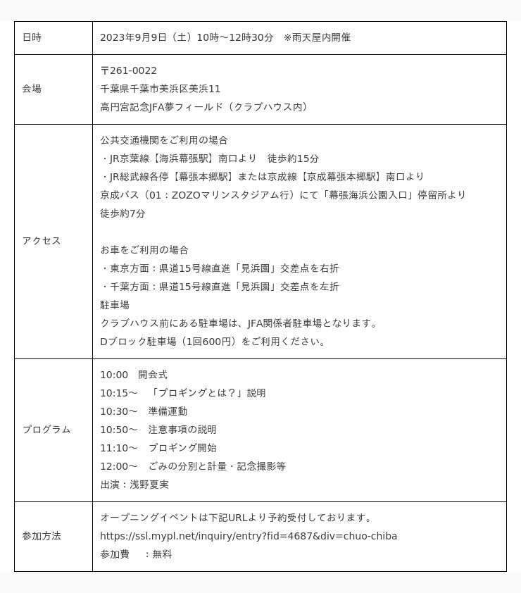 一般社団法人海と日本プロジェクト in 千葉県は、秋の海ごみゼロウィークを含む2023年9月9日(土)から2023年9月24日(日)に、千葉県幕張にてプロギングイベント「海ごみゼロウィーク2023 PLOGGING MAKUHARI」(以下、本イベント)を開催いたします。本イベントは、日本財団が推進する海洋ごみ対策プロジェクト「海と日本プロジェクト・CHANGE FOR THE BLUE」の一環で開催するものです。