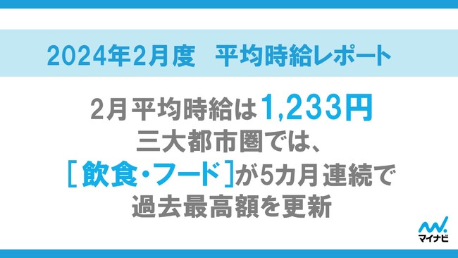 24年2月の全国平均時給は1,233円で前月比は減少。前年同月比は18カ月連続で増加。三大都市圏では、[飲食・フード]が5カ月連続で過去最高額を更新。