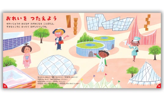 万博では、世界中からさまざまな言葉を話す人が日本を訪れます。世界の人に会った時にコミュニケーションがとれるよう、この本では基本的な4つの言葉を、8か国語(日本語、中国語、韓国語、英語、フランス語、ドイツ語、スペイン語、ポルトガル語)で教えます。