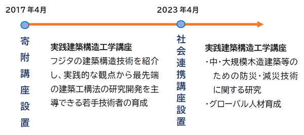 今般設置した社会連携講座では、東京理科大学とフジタが持つ、免震構造・制振構造の設計・施工・維持管理に関する技術や、木造建築物の耐震・耐火技術に関する知見等を統合することによって、日本の中大規模・中高層木造建築等における防災・減災技術を幅広く支える優れた人材の育成を目標としています。