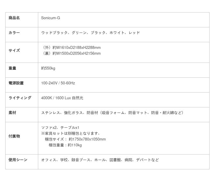 Sonicum-G(ソニカムジー)は、集中力が求められる現代のビジネス環境に最適な、1~4人用の防音ブースです。