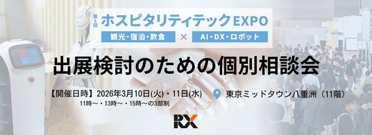 RX Japan合同会社(本社:東京都中央区、代表執行役員社長:田中岳志)は、2026年3月10日(火)と11日(水)の2日間、東京ミッドタウン八重洲(11階)にて「ホスピタリティテックEXPO 出展検討のための個別相談会」を開催いたします。