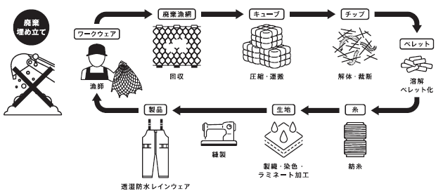 フィッシングタックルをグローバルに展開するDAIWAが「地球を想い、世界中の仲間と豊かな自然を未来へつなぐ」ことを目指し、2022年3月にスタート。本プロジェクトは廃棄漁網を糸へと再生し、ウエア等へアップサイクルするプロジェクトです。漁網は海洋プラスチック問題の原因の一つと言われ、多くの漁業関係者が廃棄に苦慮することに着目し、漁業と消費の現場にダイワ製品として提供する仕組みを構築します。