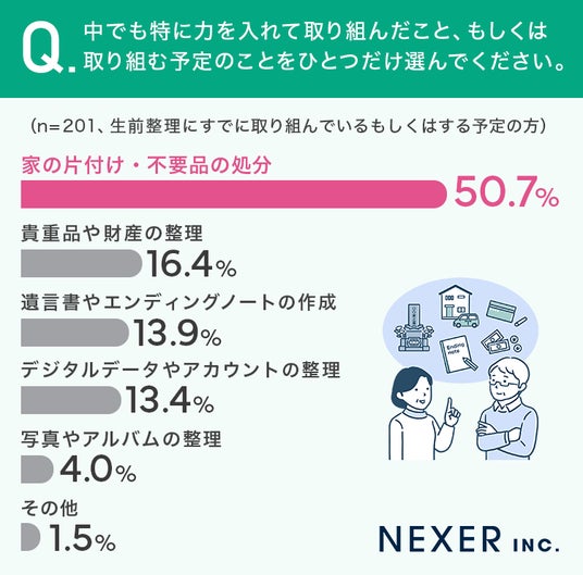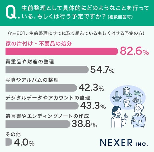 82.6%の方が「家の片付け・不要品の処分」、54.7%の方が「貴重品や財産の整理」、42.3%の方が「写真やアルバムの整理」、43.3%の方が「デジタルデータやアカウントの整理」、38.8%の方が「遺言書やエンディングノートの作成」と回答しました。