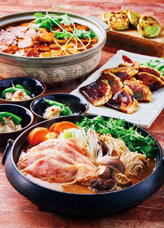 渋沢栄一生誕の地・埼玉県深谷市の名産「深谷ねぎ」と群馬県産豚肉を合わせた味噌鍋。明治維新で流行った「牛鍋」とともに食べられるようになり、渋沢栄一も西郷隆盛と食べたとされる「豚鍋」をアレンジして提供。群馬県は牛肉より豚肉の食文化。