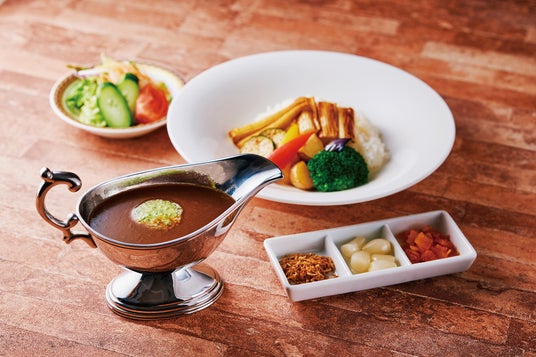 渋沢栄一がヨーロッパ視察団の一員として訪れたパリ万博、ヨーロッパ各国を訪問し出あった食文化をヒントにアレンジした夏の一品「夏野菜カレー 深谷ねぎバターとともに」をご用意します。特製ルーに深谷ねぎの甘味とバターのコクが味に深みをあたえています。香ばしく焼き目をつけた深谷ねぎやヤングコーン、ズッキーニ、茄子にパプリカなど旬の夏野菜が彩りを添えます。