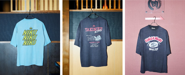今回のコラボレーションでは、焼肉きんぐの人気メニュー「きんぐカルビ」をバンドTシャツ風にアレンジしたデザインや、ポップなカラーリングでスポーツテイストに落とし込んだ“NIKU”デザインなど、いまトレンドのテイストを取り入れたアイテムに仕上げました。コラボTシャツを店舗でお買い上げいただいたお客さまには、数量限定の“肉柄エコバッグ”を先着順でプレゼントします。