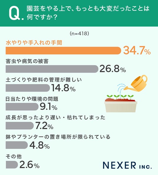 ■34.7%が、園芸をやる上で、もっとも大変だったことは「水やりや手入れの手間」