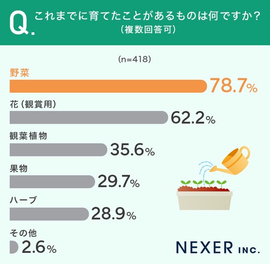「野菜」が78.7%と圧倒的に多く、たくさんの方が家庭菜園を経験していることが分かります。