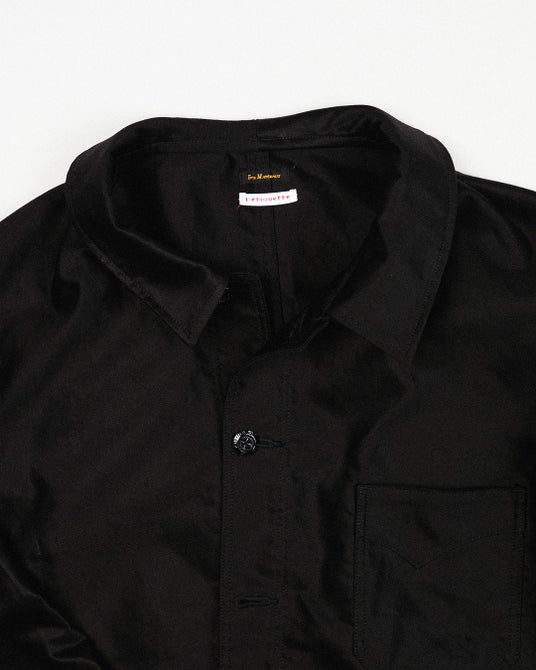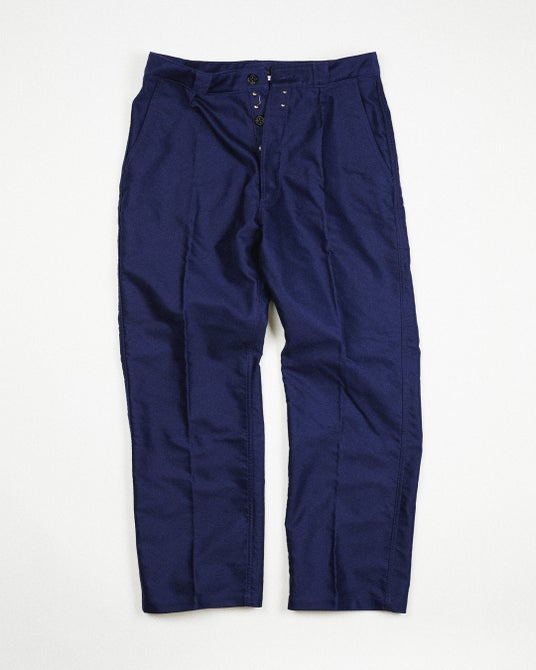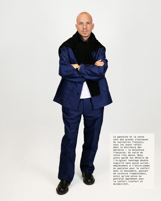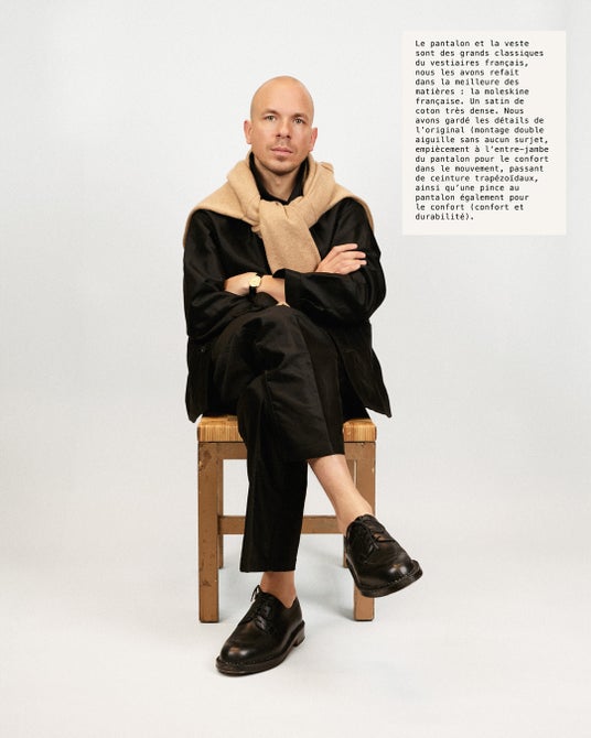 モールスキンのパンツとジャケットはフランスのワードローブの大定番ですが、日本の高密度のモールスキン、最高の素材であるコットンサテンで作りました。オリジナルのディテール(オーバーロックなしの二本針ステッチ、動きやすさを考慮したヨーク、台形のベルトループ、快適さと耐久性を考慮したパンツのタック)はすべて残しています。