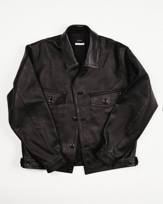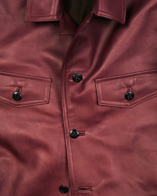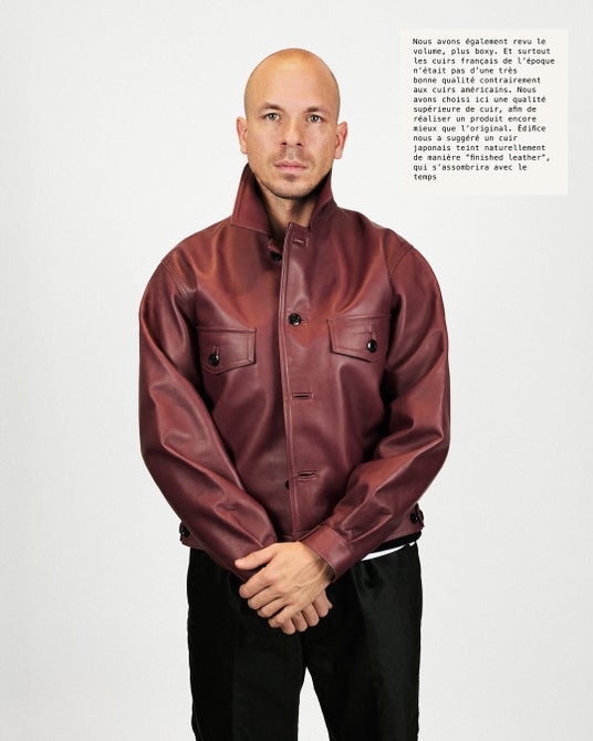 このジャケットはサイクリング・ジャケットからインスピレーションを得ています。オリジナルのレザージャケットにはジッパーが付いていることが多いのですが、閉じてしまうと、特にかがんだときに着心地が悪くなってしまいます。ここでは、(このヴィンテージジャケットのように)ファブリックバージョンによく見られるボタンに置き換えました。 ボリュームも見直し、よりボクシーになっています。そして何より、当時のフランスのレザーは、アメリカのレザーと違ってあまり質が良くありませんでした。ここでは、オリジナルよりもさらに良い製品を作るために、より上質なレザーを選びました。エディフィスの提案により、「フィニッシュ・レザー 」の手法で自然染色された日本製のレザーを使用、時間が経つにつれて色が濃くなっていきます。
