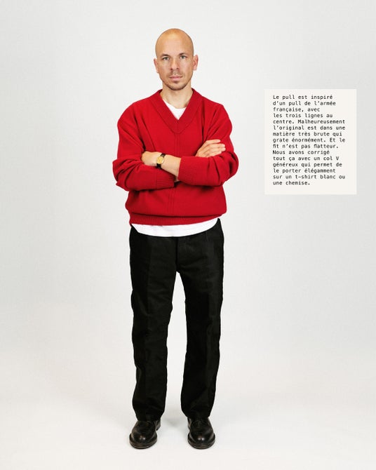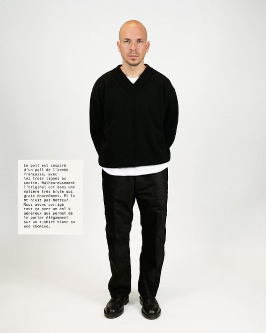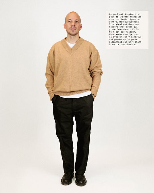 このニットは、フランス軍のニットにインスパイアされたもので、中央に3本のラインが入っています。残念なことに、当時の物はとても素朴すぎて着心地が悪いものになります。また、フィット感もお世辞にも良いとは言えません。私たちはそれらを修正し、白いTシャツやシャツの上にエレガントに着ることができるように、ゆとりのあるVネックに作り上げています。