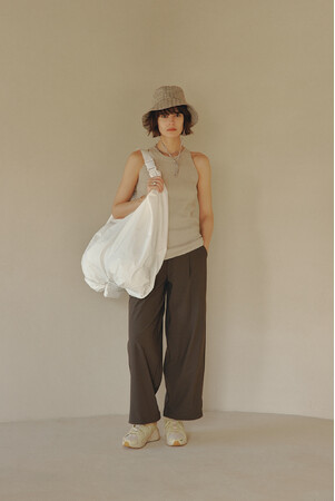 海で廃棄される漁網ネットや生地の端材、工業用ナイロンなど廃棄物を原料とする再生ナイロンを使用したサステナブルなコレクション。今シーズンは深みのあるブラウンをキーカラーに、大人のリラクシーさ漂うデザインに。 伸縮性に富み、シワになりにくいのも特徴で、アクティブシーンにも活躍します。