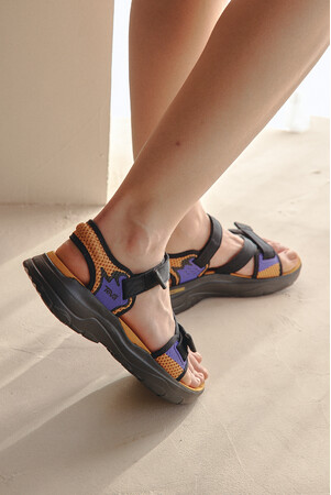 Tevaのサステナブル素材を使用したモデルを、アーシーな色味のフットベッドに、ポイントで鮮やかなパープルを効かせたファッショナブルなカラーリングで別注。