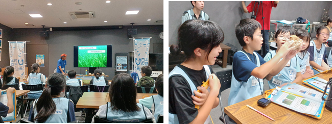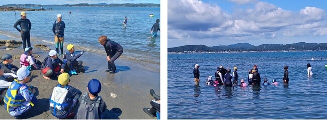 館山湾の沖ノ島でシュノーケリングをし、直前に講義で学んだアマモを自分たちの目で見て、海を守る取り組みを体験しました。実際にアマモ場や海の生き物を見て、海の色や温度を感じた子どもたちは、海への親近感をより強めていました。