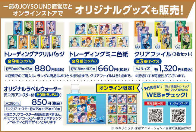 さらに、コラボキャンペーン限定のオリジナルグッズ「トレーディングアクリルバッジ【全9種/ランダム】」「トレーディングミニ色紙【全9種/ランダム】」「クリアファイル(3枚セット)【全3種/オープン】」「オリジナルラベルウォーター/ミニクリアコースター付【全9種/ランダム】」を、JOYSOUND直営店10店舗とオンラインストアにて販売いたします!※オリジナルラベルウォーターのみオンライン限定